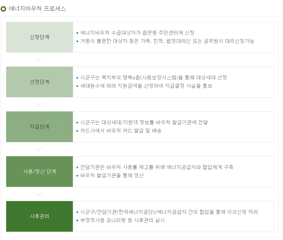 국민 모두가 따뜻한 겨울을 보낼수 있도록 에너지 취약계층을 위해 에너지바우처(이용권)을 지급하여 전기, 도시가스,지역난방,등유,LPG,연탄을 구입할 수 있도록 지원하는 제도이다.