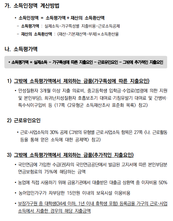 대상자의 소득은 소득평가액을 의미하며, 실제가구소득에서 가구 특성별 지출비용과